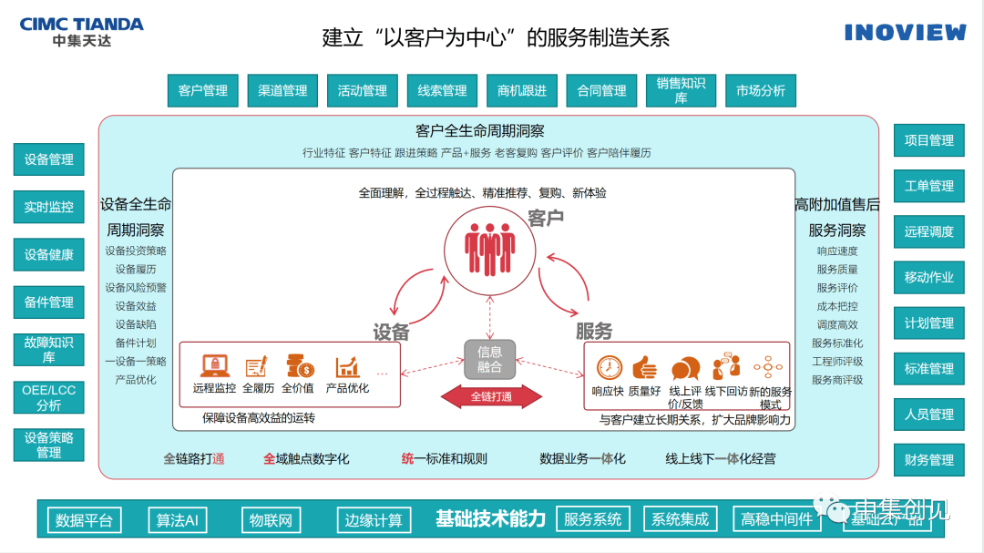 中集創(chuàng)見設(shè)備管理及售后服務(wù)管理解決方案針對裝備制造企業(yè)的管理基礎(chǔ),導(dǎo)入最佳實踐理論與模型,以管理目標、價值實現(xiàn)為導(dǎo)向,融合新技術(shù),建立以“客戶為中心”的服務(wù)制造關(guān)系,覆蓋設(shè)備后服務(wù)市場全周期、全價值、全場景的閉環(huán)管理,實現(xiàn)人財物一體化管理。打造全場景互通的數(shù)據(jù)鏈,將智能化融入到企業(yè)研發(fā)、制造、銷售、服務(wù)等全過程,有效驅(qū)動企業(yè)經(jīng)營決策更智慧、更高效、更高價值、更精細。