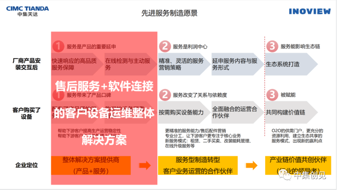 中集創(chuàng)見 “服務(wù)制造轉(zhuǎn)型解決方案”聚焦于幫助制造商向高附加值的高端設(shè)備售后服務(wù)升級,充分挖掘產(chǎn)業(yè)鏈需求,優(yōu)化價值空間,推動生產(chǎn)型制造向服務(wù)型制造轉(zhuǎn)變。